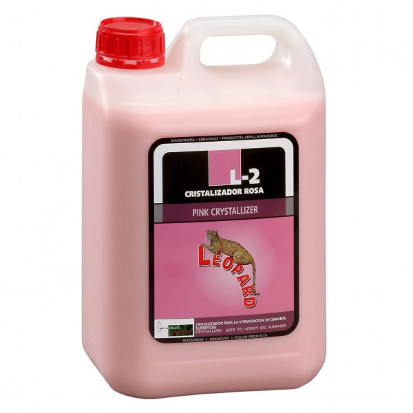 Cristalizador de suelos Leopard-2 Rosa para suelos de mármol, terrazo y piedra calcárea, especialmente formulado para el vitrificado de grandes superficies. Proporciona al pavimento la impermeabilización y dureza necesaria para la resistencia al tráfico intenso. No resbala ni marca las pisadas.